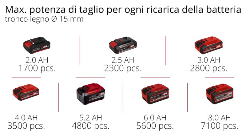 Lo schema mostra indicativamente il numero di troncature effettuabili con lo svettatoio GP-LS 18/35 Li di un ramo di sezione 15 mm, a seconda della capacità della batteria montata sull’elettroutensile.